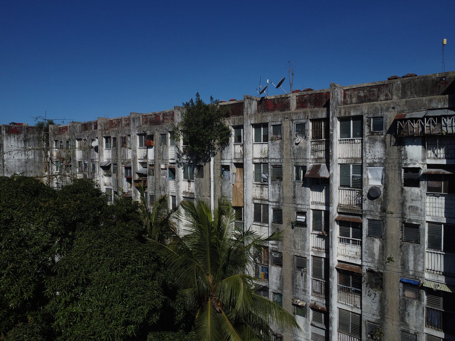 The Manila heat can be relentless. The air hangs heavy with humidity and smog. We drive toward a large concrete structure, passing through a sea of one- to two-story buildings. Its exterior is battered and worn. The building resembles a ship caught in rough waters: massive, weathered, and seemingly forgotten. As we drive along the 150-meter-long, seven-story-high wall on one side, we pass a row of small food stalls crowded with people, spilling onto the street, navigating the traffic. We turn the corner and park just outside the entrance to the Tenement.