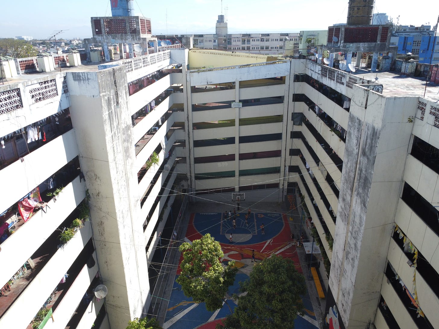 Built to rehouse 720 families from nearby informal settlements, the Tenement is a postwar housing project that still stands more than six decades after its completion. The concrete mass consists of two long housing bars connected by two ever-buzzing ramps that flank a shared central courtyard. Each 20sqm unit is cross-ventilated, with windows on each end of the room. The ground floor, including the space around the courts, has self-organized into overlapping zones for sports, performance, and play. Even a clinic, a community center, and a chapel emerged from what was once conceived as only housing. The ramps function like vertical highways, while the courtyard provides a central platform for fiestas, congregations, and games. In recent years, the basketball court has gained media attention, serving as a canvas for public art and community expression, most notably a mural honoring Kobe and Gianna Bryant after their passing.